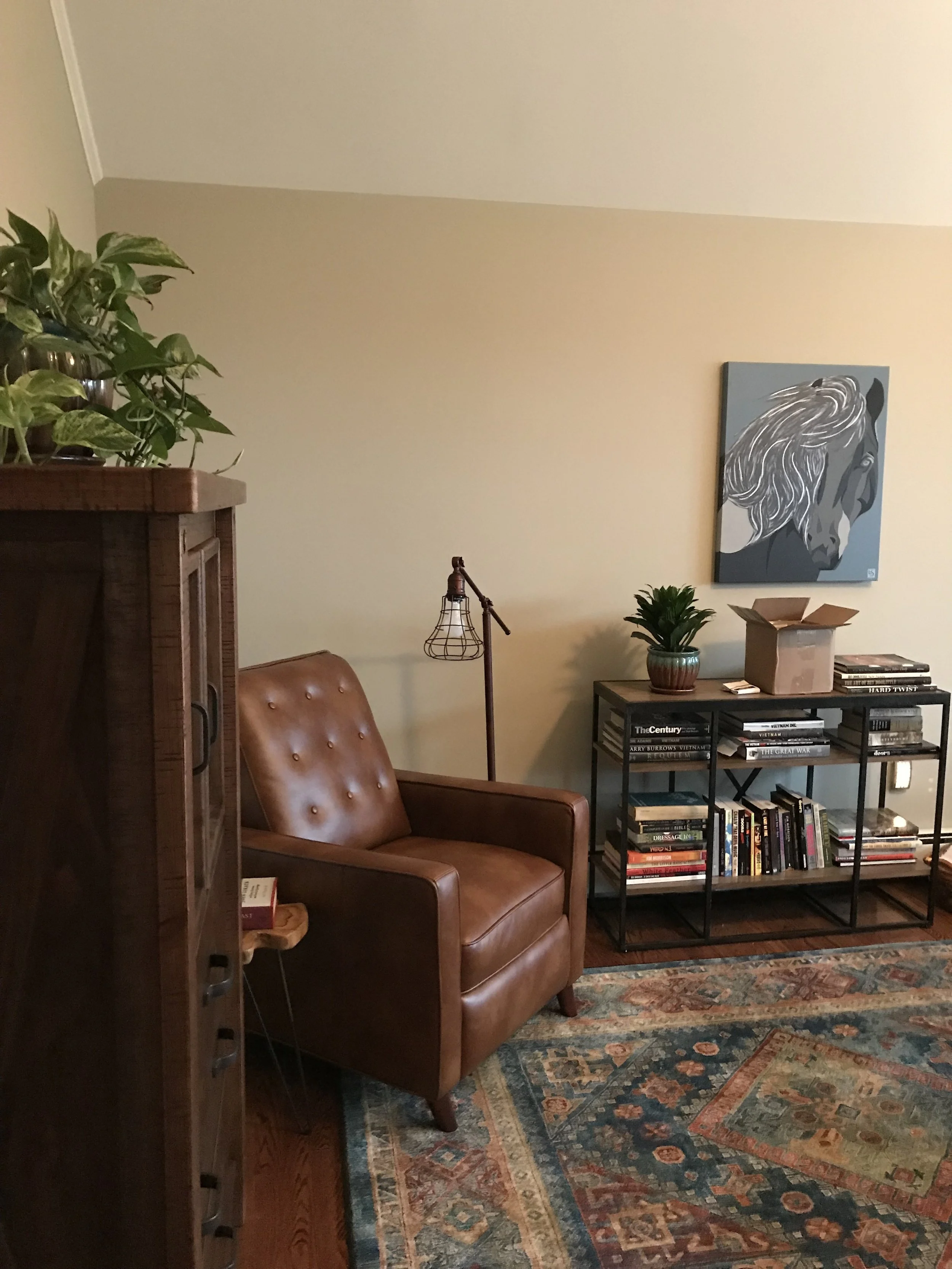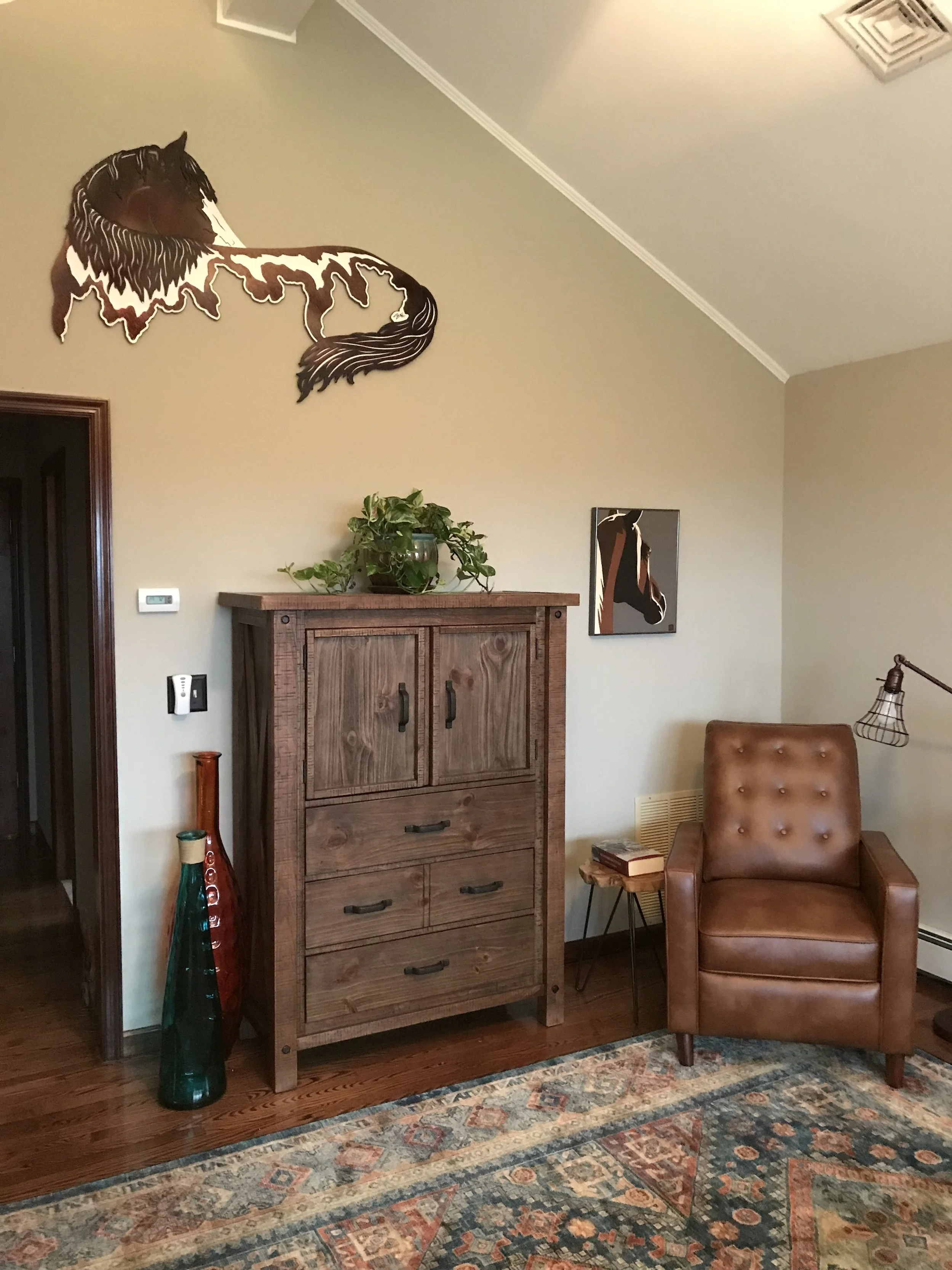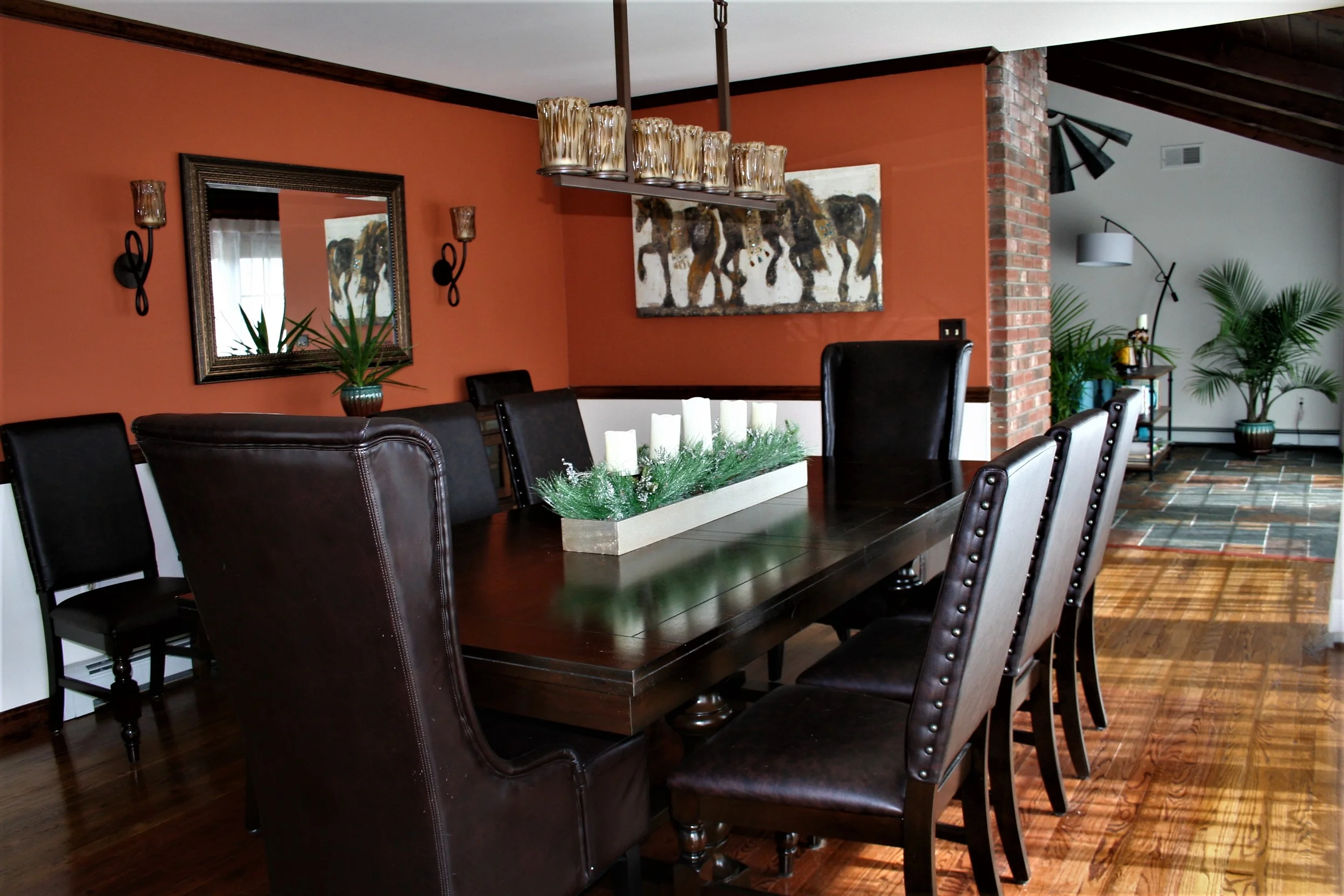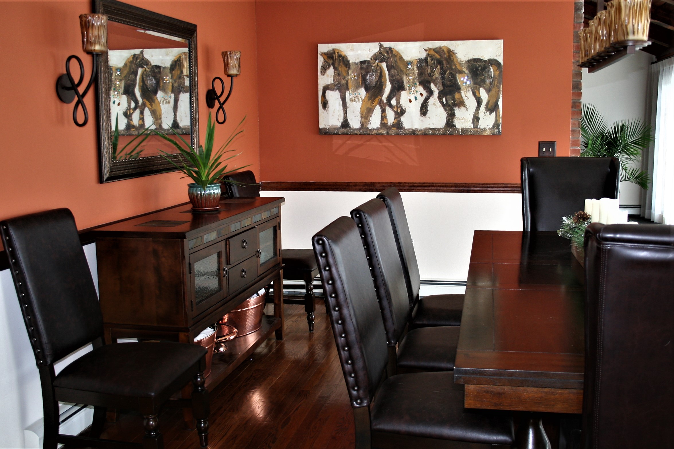 Although the floor plan and location were perfect, the previous owners’ style was not at all like theirs. Rooms filled with floral wallpaper, heavy drapery, and formal furnishings had to be replaced with a style compatible with their more laid back and casual personalities. By removing the wall paper and replacing carpeting in the Living Room with a natural multicolored slate floor the natural wood on the ceiling, doors and trim look more appropriate. Removing the heavy drapery and replacing them with natural textured linen panels hung on a track rod allows light and the fabulous view of the mountain ridge in during the day but gives privacy and bounces back light into the space at night. A large sectional sofa in a teal blue allows comfortable viewing of the fireplace as well as the TV and provides plenty of comfortable seating. A large arc floor lamp overhangs the sofa making a cozy reading area. The floor is softened by an area rug and large tapestries help to fill the wall with interest and color. I was fortunate to have a client who is an artist so utilizing her paintings for the artwork expresses both their love for horses and personalizes this wonderful home. A favorite piece of metal art hangs over the fireplace with lighting installed to properly accent it. Taking my cue from the warm brick of the floor to ceiling fireplace we chose a rich terra cotta color(Sherwin Williams 6348-Reynard) to begin at the far wall of windows and extend into the Dining Room.